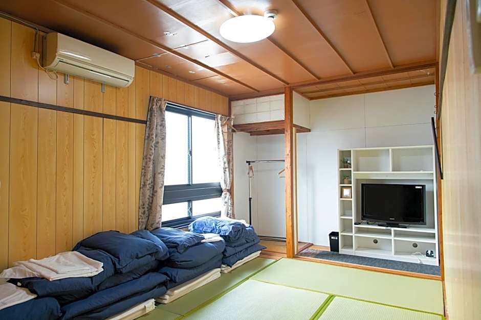 The well-fitted kitchen has a refrigerator, kitchenware and a microwave. The quadruple room offers air conditioning, tatami, as well as a shared bathroom boasting a bath or a shower and a hairdryer. The unit has 4 futons.